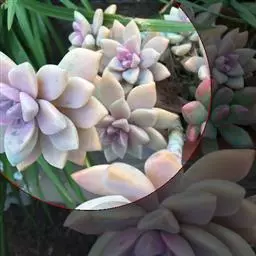 紫珍珠是景天科石莲花属的多年生肉质草本植物。植株中小型;叶片肉质,匙形,呈莲座状紧密排列;叶片粉紫色,…