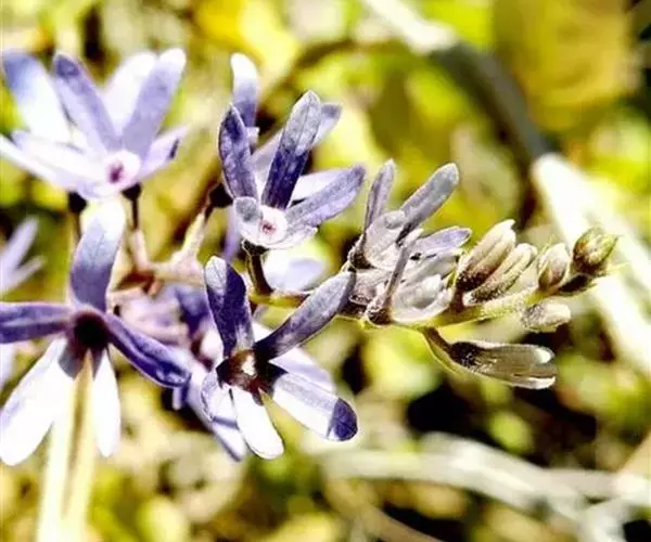 总状花序顶生,下垂,总花梗长10厘米以上,被短毛。花蓝紫色;萼管长2-3毫米,陀螺形,密被棕色微绒毛,裂片狭长圆形,开展,结果时长约2厘米,宽约5毫米;花冠长约0.8-1厘米,5深裂,外面密被微绒毛,喉部有髯毛;雄蕊4,近等长。