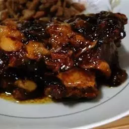 铁板牛仔骨 12、迅速出锅倒在烧热的铁板上撒上香葱末即可趁热吃了。