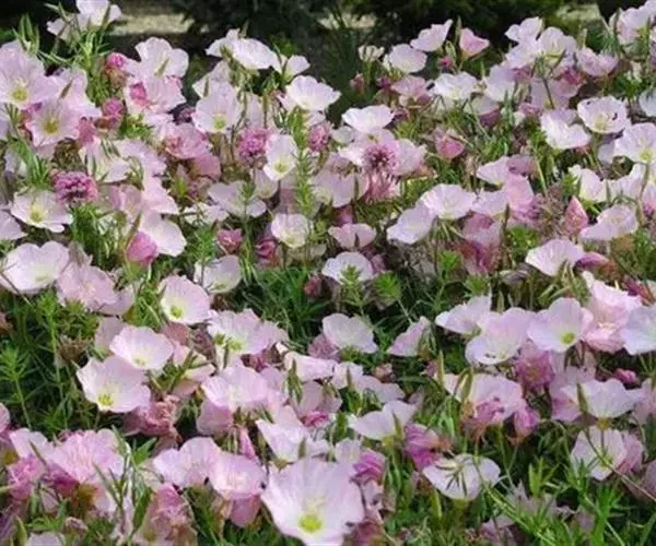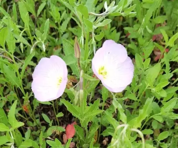 根圆柱状,茎直立,幼苗期呈莲座状,基部有红色长毛,叶互生,茎下部分有柄,上部的叶无柄;叶片长圆状或披针形,边缘有疏细锯齿,两面被白色柔毛。花单生于枝端叶腋,排成疏穗状,萼管细长。花白至粉红色,花径达8厘米以上,5至10月花开不断。高度范围:50-80厘米,美丽月见草(Oenothera speciosa)为低矮的地被植物,生长强健、非常耐旱,适应范围广。花期4-10月份,花为靓丽的粉红色,花径大,花量多。具有非常强的自播繁衍能力。可以大面积的景观布置,也可以作为花坛花栽培。既可以直接露地播种栽培,也可以作为地被植物被苗圃单位生产销售。可以春、夏、秋播种。也可以冬季保护地播种移栽。每天傍晚开放至次日近午凋萎。不耐严寒,江南可露地避风越冬。繁殖可秋播。生长习性:喜光,耐寒,忌积水。