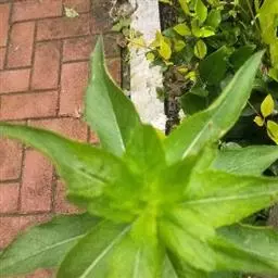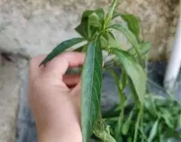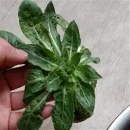 叶柄淡紫红色,长0.5-1.5厘米,开花时基生叶枯萎。茎生叶灰绿色,披针形(轮廓)或长圆状卵形,长3-6厘米,宽1-2.2厘米,先端下部的钝状锐尖,中上部的锐尖至渐尖,基部宽楔形并骤缩下延至柄,边缘具齿突,基部细羽状裂,侧脉6-8对,两面被曲柔毛;