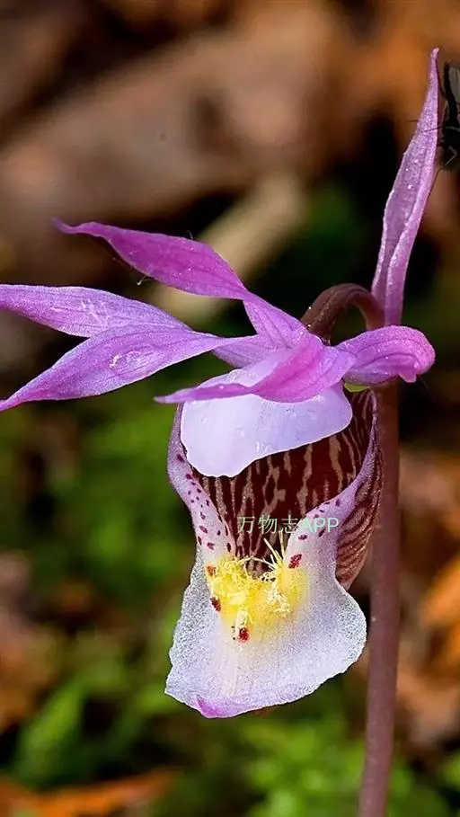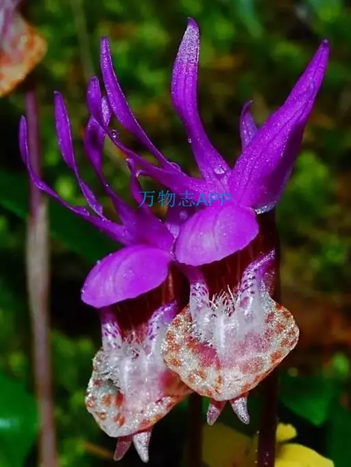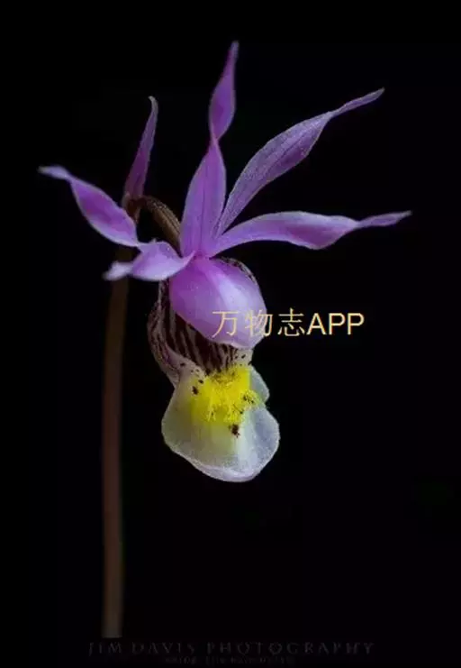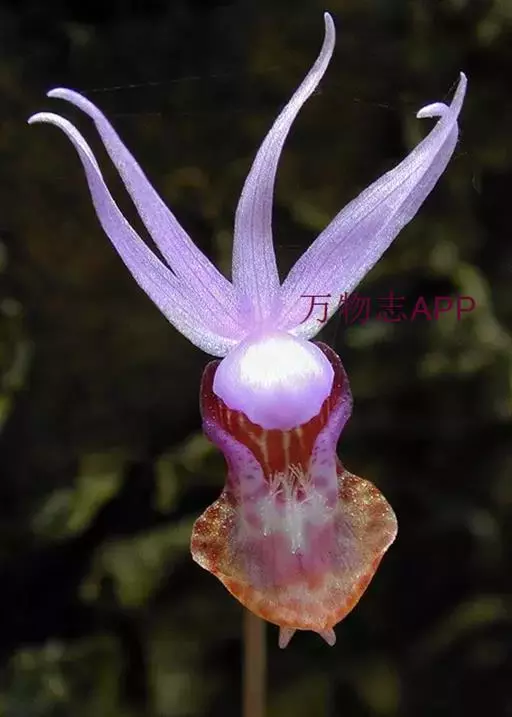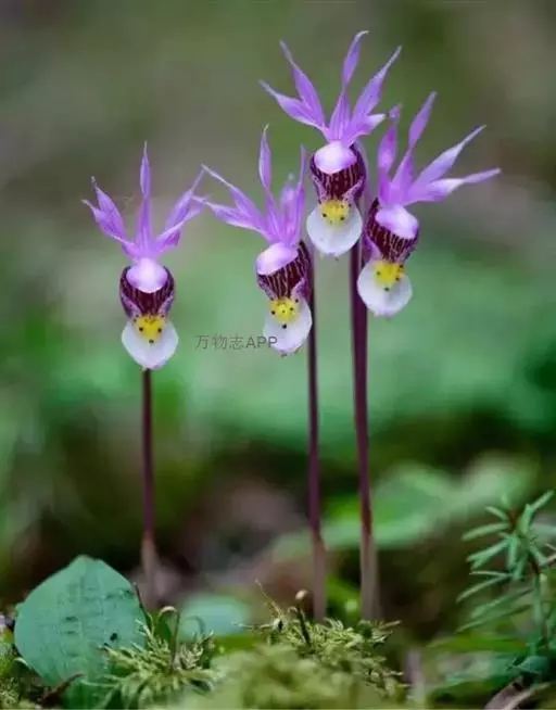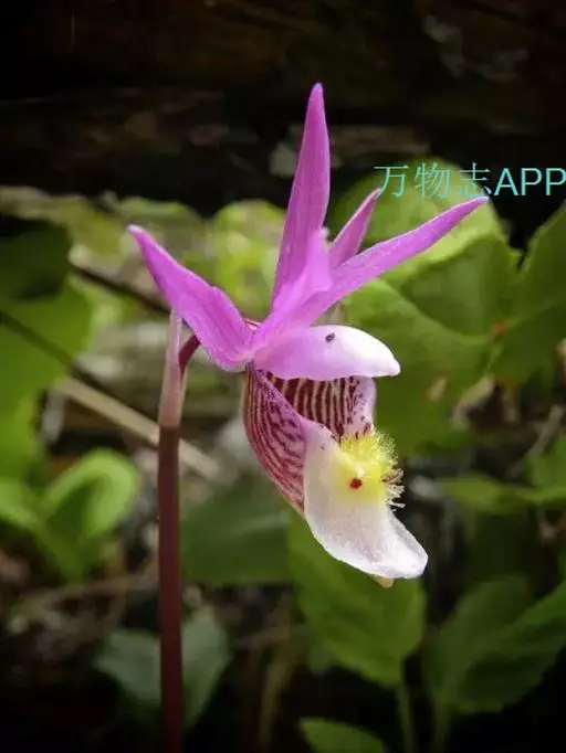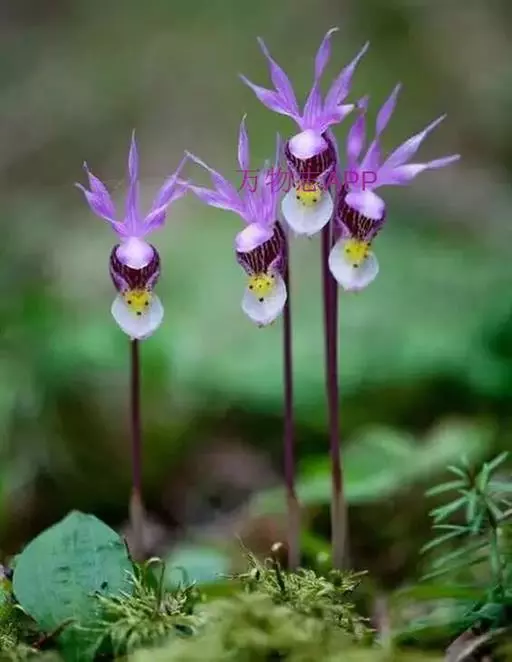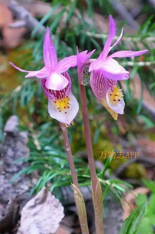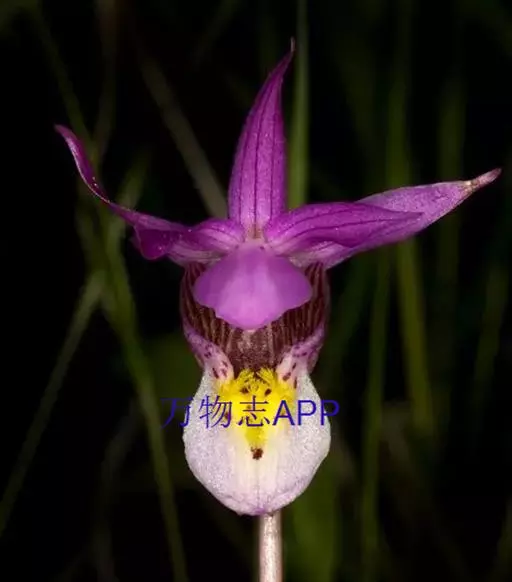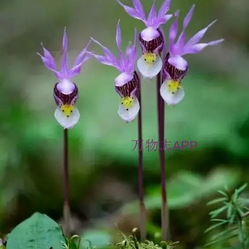 布袋兰(学名:Calypso bulbosa (L.) Oakes):假鳞茎近椭圆形、狭长圆形或近圆筒状,有节,常有细长的根状茎。叶1枚,卵形或卵状椭圆形。花葶长10-12厘米,明显长于叶,中下部有2-3枚筒状鞘;花单朵,直径3-4厘米;萼片与花瓣相似,向后伸展,线状披针形;唇瓣扁囊状(上下压扁),3裂。花期4-6月。