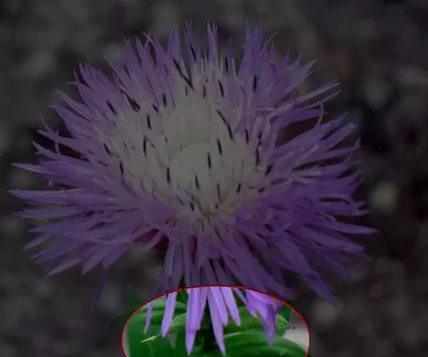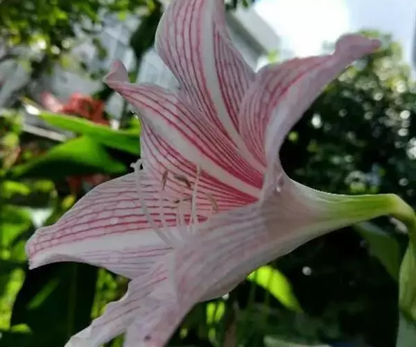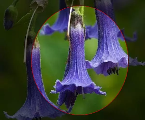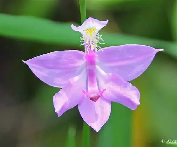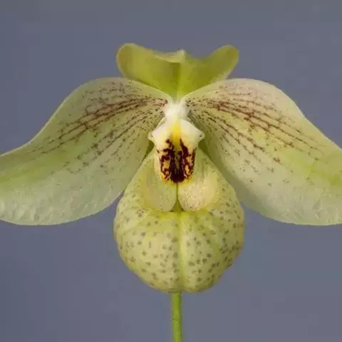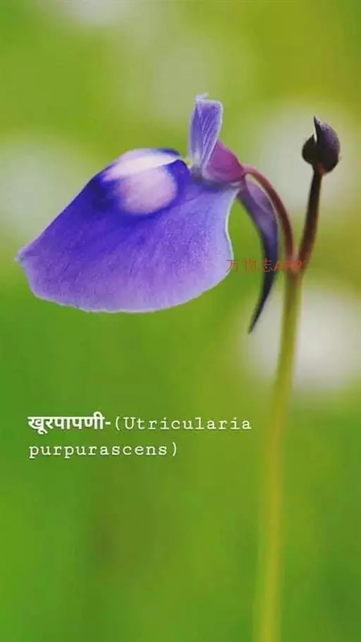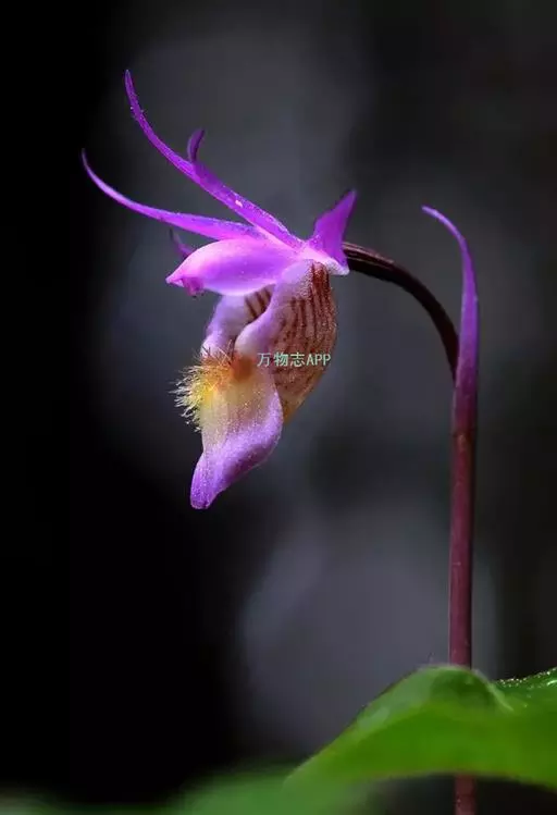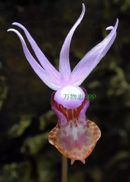 花葶长10-12厘米,明显长于叶,中下部有2-3枚筒状鞘;花苞片膜质,披针形,长1.5-1.8厘米,下部圆筒状并围抱花梗和子房;花梗和子房纤细,长1.7-2厘米;花单朵,直径3-4厘米;萼片与花瓣相似,向后伸展,线状披针形,长1.4-1.8厘米,宽1.5-2毫米,先端渐尖;唇瓣扁囊状(上下压扁),3裂;侧裂片半圆形,近直立,长3-4毫米,宽5-6毫米;中裂片扩大,向前延伸,呈铲状,长8-10毫米,基部有髯毛3束或更多;囊向前延伸,长2-2.3厘米,宽约1厘米,有紫色粗斑纹,末端呈双角状;蕊柱长8-10毫米,两侧有宽翅,全宽约1厘米,倾覆于囊口。花期4-6月。