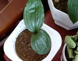 布袋兰的假鳞茎近椭圆形、狭长圆形或近圆筒状,长1-2厘米,宽5-9毫米,有节,常有细长的根状茎。叶1枚,卵形或卵状椭圆形,长3.4-4.5厘米,宽1.8-2.8厘米,先端近急尖,基部近截形;叶柄长2-3厘米。