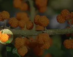果实近球形, 直径约1厘米,桔红色,初期被疏柔毛,成熟时无毛;核具细皱纹。花期5-6月,果期 7-8月。
