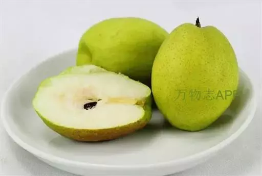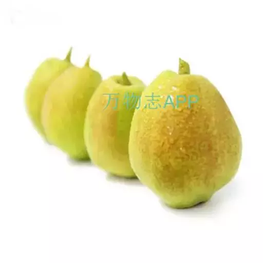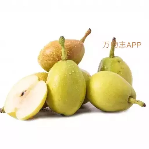 新疆梨 乔木,高达6-9米,树冠半圆形,枝条密集开展;小枝圆柱形,微带稜条,无毛,紫褐色或灰褐色,具白色皮孔;冬芽卵形,先端急尖,鳞片边缘具白色柔毛。叶片卵形、椭圆形至宽卵形,长6-8厘米,宽3.5-5厘米,先端短渐尖头,基部圆形,稀宽楔形,边缘上半部有细锐锯齿,下半部或基部锯齿浅或近于全缘,两面无毛,或在幼嫩时具白色绒毛;叶柄长3-5厘米,幼时具白色绒毛,不久脱落;托叶膜质,线状披针形,长8-10毫米,先端渐尖,边缘具有稀疏腺齿,被白色长绒毛,早期脱落。伞形总状花序,有花4-7朵,花梗长1.5-4厘米,总花梗和花梗均被绒毛,以后脱落无毛;苞片膜质,线状披针形,长1-1.3厘米,先端渐尖,边缘有疏生腺齿和褐色长绒毛,早落;花直径1.5-2.5厘米;萼筒外面无毛;萼片三角卵形,先端渐尖,约长于萼筒之半,边缘有腺齿,长6-7毫米,内面密被褐色绒毛;花瓣倒卵形,长1.2-1.5厘米,宽0.8-1厘米,先端啮蚀状,基部具爪;雄蕊20,花丝长不及花瓣之半;花柱5,比雄蕊短,基部被柔毛。果实卵形至倒卵形,直径2.5-5厘米,黄绿色,5室,萼片宿存;果心大,石细胞多;果梗先端肥厚,长4-5厘米。花期4月,果期9-10月。