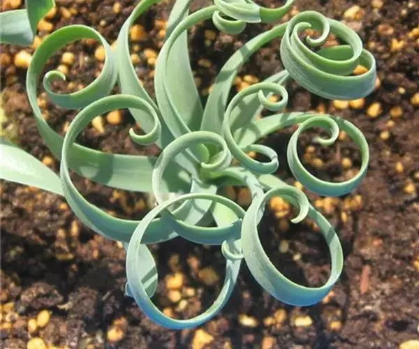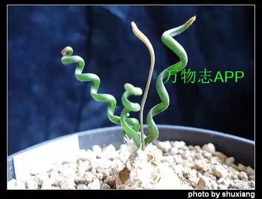肉质叶由鳞茎顶部长出,线形,先端变细,表面光滑或有白色毛刺,叶先直立生长,后逐渐扭曲盘旋,致使叶前端呈弹簧状。