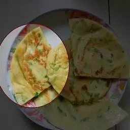 10. 炒勺烧热,放香油,待热时将打散的鸡蛋汁倒入锅中,摊成蛋饼,两面煎黄,盖在合菜上,即全部完成。