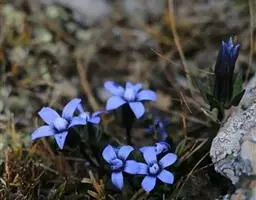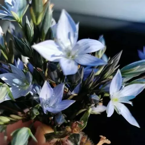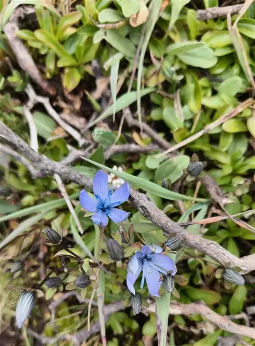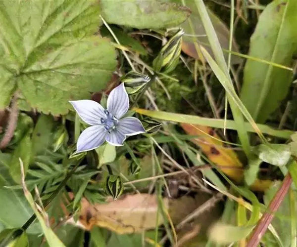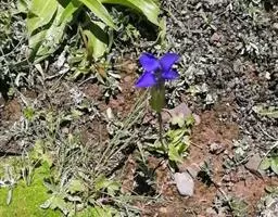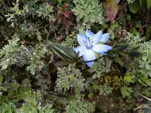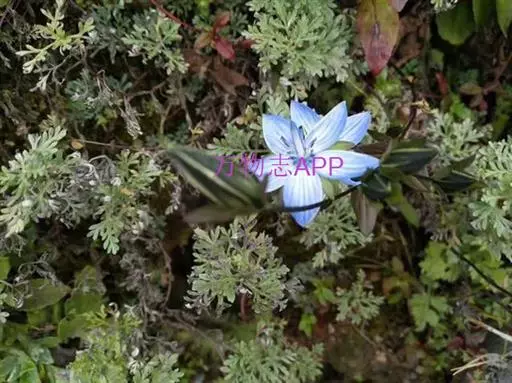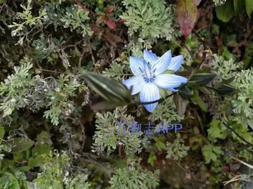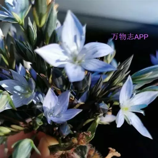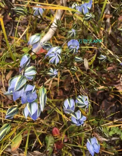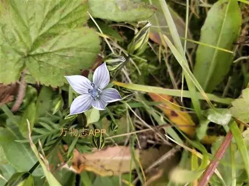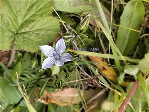 辐状肋柱花,又名辐花侧蕊。一年生草本,高15-40厘米。茎不分枝或自基部有少数分枝,近四棱形,直立,绿色或常带紫色。叶无柄,狭长披针形、披针形至线形,长至43毫米,宽1.5-4毫米,枝及上部叶较小,先端急尖,基部钝,半抱茎,中脉在两面明显。花5数,顶生和腋生,直径2-3厘米,花梗直立或斜伸,四棱形,不等长,长至8厘米;花萼较花冠稍短或等长,裂片线形或线状披针形,稍不整齐,长8-22(27)毫米,先端急尖,花冠淡蓝色,具深色脉纹,裂片椭圆状披针形或椭圆形,一般长1.5-2.5厘米,先端钝或急尖,基部两侧各具1个腺窝,腺窝管形,边缘具不整齐的裂片状流苏;花丝线形,长6-8毫米,花药蓝色,狭矩圆形,长3-4.5毫米;子房无柄,长12-14毫米,柱头小,三角形,下延至子房下部。蒴果狭椭圆形或倒披针状椭圆形,与花冠等长或稍长;种子淡褐色,圆球形,直径0.3-0.4毫米,光滑。染色体2n=10。花果期8-9月。