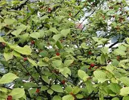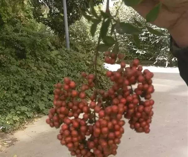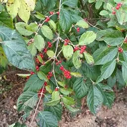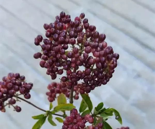 果实红色,极少蓝紫黑色,卵圆形或近圆形,直径3-5毫米;分核2-3枚,卵圆形至椭圆形,长2.5-3.5毫米,略有皱纹。