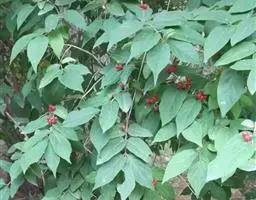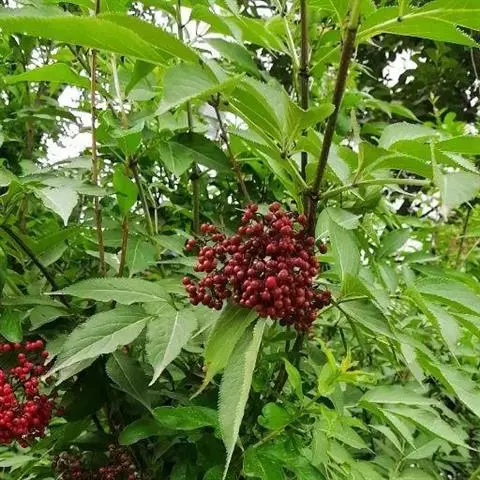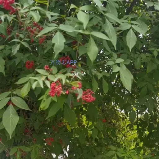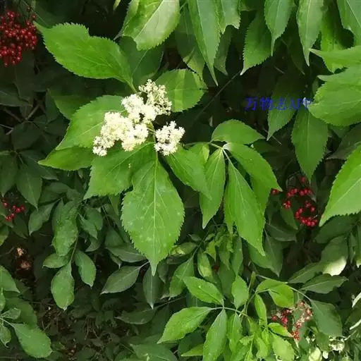 接骨木(学名:Sambucus williamsii Hance)属落叶灌木,高达4米。茎无棱,多分枝,灰褐色,无毛。叶对生,单数羽状复叶;小叶卵形、椭圆形或卵状披针形,先端渐尖,基部偏斜阔楔形,边缘有较粗锯齿,两面无毛。圆锥花序顶生,边缘有较粗锯齿,两面无毛。圆锥花序顶生,密集成卵圆形至长椭圆状卵形;花萼钟形,5裂,裂片舌状;花冠辐射状,45裂,裂片倒卵形,淡黄色;雄蕊5枚,着生于花冠上,较花冠短;雌蕊1枚,子房下位,花柱短浆果鲜红色。花期4-5月,果期7-9月。