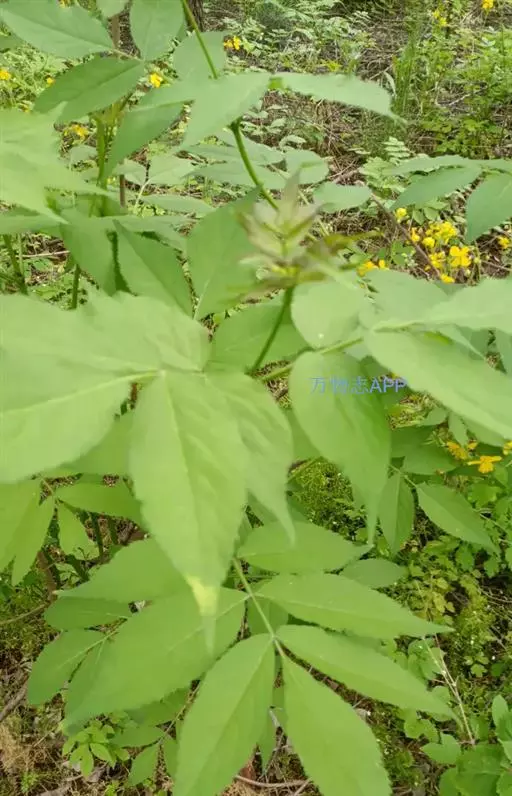 毛接骨木本种与接骨木的区别是:奇数羽状复叶有小叶片2-3对,小叶片主脉及侧的基部被明显的长硬毛,小叶柄、叶轴及幼枝被黄色长硬毛;花序轴除被短柔毛外还夹杂着长硬毛。