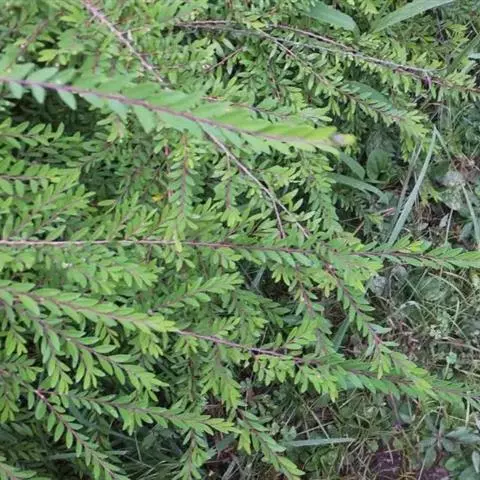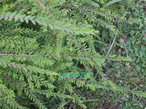 茎多分枝,枝条纤细柔 软,嫩枝紫褐色,在侧枝呈羽状排列。单叶,互生而排成2列,具短柄,叶片长1.2~1.6公分,宽约0.3公分,倒披针状线形,叶基楔形。花梗纤细,长0.5~2公分,紫红色叶尖,全缘侧脉不明显,托叶细小,三角形,先端尖锐。单性花,雌雄同株,花数朵丛生,腋出,雄花花被6片,基部合生,卵形,平滑,雄蕊3枚,花丝极短,花盘浅6裂,雌花花被片较狭,尖锐,子房平滑,花柱三枚,短而开裂。果实为蒴果,扁圆形,径约0.3公分,外具三浅纵沟,平滑。