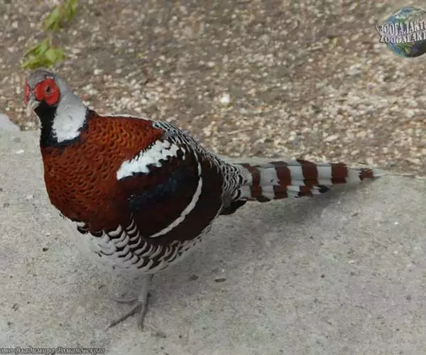 雄鸟额、头顶和枕橄榄灰褐色,后颈灰色,颈侧白而沾灰。脸裸露,鲜红色,耳羽淡灰褐色,眼上有一短的白色眉纹、颏、喉及前颈黑色,上背和胸辉栗色,具金黄色羽端和黑色中央次端斑;肩羽基部栗色,逐渐变为黑色,并具宽阔的白色端斑,在两肩各形成一条宽阔的白带。下背、腰及较短的尾上覆羽黑色而具蓝色金属光泽,并具细窄白色横斑和羽缘;较长的尾上覆羽和尾羽橄榄灰色,具宽阔的栗色横斑;翅上覆羽辉暗赤褐色,覆羽中部横贯以钢蓝色斑块,大覆羽具黑色横斑和白色羽端。初级飞羽暗褐色,外翈端部棕色而杂有褐斑;次级飞羽浅栗色而具灰色端缘。腹棕白色,胁栗色,尾下覆羽绒黑色。