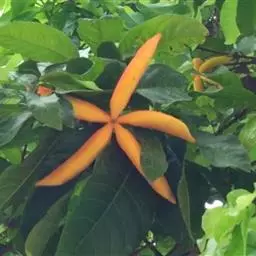 香苹婆 乔木;枝轮生,平伸。叶聚生于小枝顶端,为掌状复叶,有小叶7-9片,小叶椭圆状披叶形,长10-15厘米,宽3-5厘米,顶端长渐尖或尾状渐尖,基部楔形,幼时有毛,成长后无毛;叶柄长10-20厘米;托叶剑状,早落。圆锥花序直立,着生在新枝的近顶部,有多花;小苞片细小,花梗比花短;萼红紫色,长约12毫米,5深裂几至基部,萼片椭圆状披针形,向外广展,外面被淡黄褐色短柔毛,内面的上部密被白色长绒毛,远比萼筒长;雄花的花药有12-15个,聚生成头状;雌花的心皮5枚,被毛,花柱弯曲,柱头5裂。蓇葖果木质,椭圆形且似船状,长5-8厘米,顶端急尖如喙状,几无毛,每果有种子10-15个;种子椭圆形,黑色而光滑,长约1.5厘米。花期4-5月。