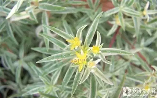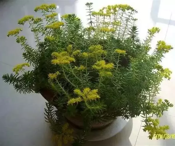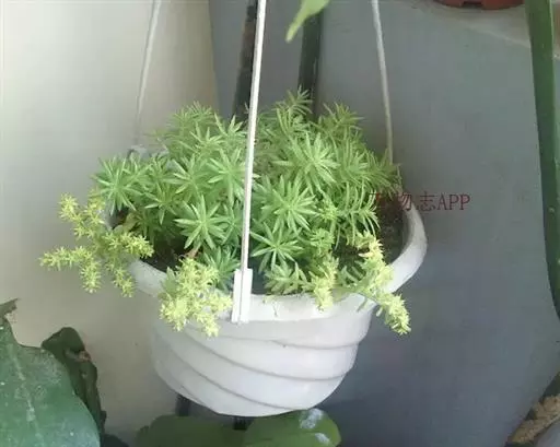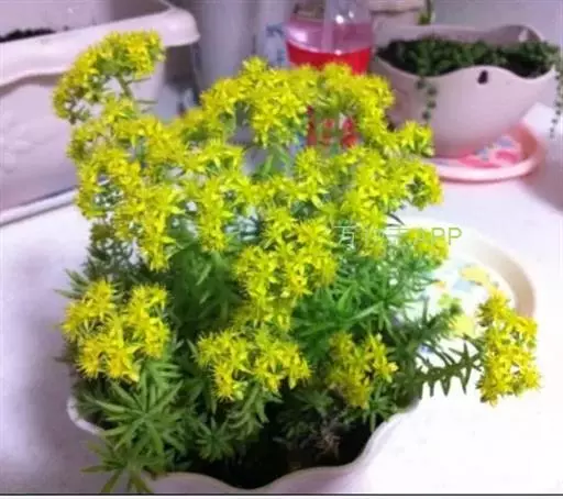 佛甲草是多年生肉质草本,全体无毛。茎纤细倾卧,长10~15厘米,着地部分节节生根。叶3~4片轮生,近无柄,线形至倒披针形,长2~2.5厘米,先端近短尖,基部有短矩。聚伞花序顶生,花黄色,细小;萼5片,无距或有时具假距,线状披针形,长1.5~7毫米,钝头,通常不相等:花瓣5,矩圆形,长4~6毫米,先端短尖,基部渐狭;雄蕊10,心皮5个,成熟时分离,长4~5毫米,花柱短。蓇葖果。花期春末夏初。含水量极高,其叶、茎表皮的角质层具有超常的防止水分蒸发的特性。佛家草生长适应性强,耐寒、耐旱、耐盐碱、耐瘠,抗病虫害,茎肉多汁,碧绿的小叶宛如翡翠,整齐美观,既可作为盆栽欣赏,也可作为露天观赏地被栽植。 佛甲草