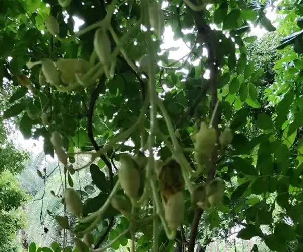 吊瓜树没有蹲苗现象,造林后第2个月每株追施复合肥100克,同时进行扩穴抚育。半年后高生长1.2米以上,地茎粗2.5厘米左右。吊瓜树速生,侧枝发达,主干往往呈弯弓形,要注意及时修枝,发现主干弯曲时要及时用木棍撑直或捆绑纠正。植后2年内每年追施复合肥2次,选在雨季的初期和中期进行,并及时砍除林地内的杂灌。3年树高达5-6米,胸径7-8厘米,冠幅3-4米,完全郁闭。吊瓜树十分耐旱,在国内各引种区干旱季节都能保持正常生长,没有休眠或半休眠的现象。