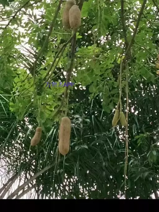 吊瓜树(学名:Kigelia africana (Lam.) Benth.)是紫葳科吊灯树属植物,常绿乔木,高10~15米,枝下高约2米,胸径约1米。奇数羽状复叶交互对生或轮生,叶轴长7.5-15厘米;小叶7-9枚,长圆形或倒卵形。圆锥花序生于小枝顶端,花序轴下垂,长50-100厘米。果下垂,圆柱形,坚硬,肥硕,不开裂,果柄长8厘米。种子多数,无翅,镶于木质的果肉内。