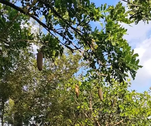 吊瓜树是分布在热带非洲典型的速生树种,其树姿婆娑婀娜,树冠广伞形,四季常青,开花成串下垂,花大艳丽,特别是一条条悬挂在细枝上的硕大果实酷似大型炮弹,经久不落,蔚为壮观,疑为人工点缀。引入中国热带、南亚热带地区主要作为庭园及小区绿化,景观及遮光效果良好。