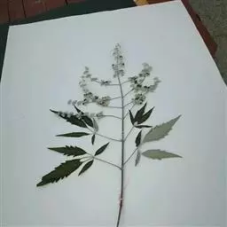 白毛黄荆(Vitex negundoL.f.albaPei),灌木;小枝密生灰白色绒毛。小叶通常3,罕有5;小叶片阔披针形至卵形,全缘或偶有少数锯齿,两面密生灰白色绒毛。花序较紧缩。