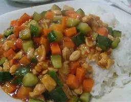 宫保鸡丁盖饭是一道简单的家常饭,主料是鸡胸肉、青笋、胡萝卜、大蒜、葱、干辣椒、盐、味精、胡椒粉、糖、醋、老抽、料酒、淀粉,热白饭一碗。