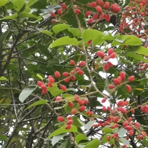 花多数,通常数个簇生排成顶生宽聚伞圆锥花序,或下部兼腋生聚伞总状花序,花序长可达15厘米,侧枝长在5厘米以下,花序轴无毛或被疏微毛;花芽卵球形,顶端急狭成锐尖或渐尖;花梗长1-2毫米;萼三角形,顶端尖;花瓣倒卵形,雄蕊与花瓣等长。核果圆柱状椭圆形,长7-10毫米,直径4-5毫米,有时顶端稍宽,基部有盘状的宿存花盘;果梗长2-3毫米,无毛。花期7-10月,果期翌时年4-7月。