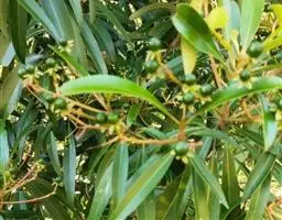灌木,通常3-5米。枝条褐色,有浅棕色纵裂的皮孔,无毛。叶常生于枝条的梢端,线状披针形,长4-12(16)厘米,宽约1-2.5(3.2)厘米,先端渐尖,基部渐狭成楔形,革质,上面无毛,但不甚光亮,下面暗粉绿色,无毛,或嫩叶有时有贴伏微柔毛,中脉上面平坦,下面明显,侧脉纤细,每边约6-8(11)条,两面不明显或明显,小脉密网状,两面形成蜂巢状浅窝穴;叶柄长7-15毫米。聚伞状圆锥花序多数,生于新枝上端,少分枝,通常长约3厘米,无毛,或总梗和各级序轴、花梗被或疏或密的绢状微毛;花黄色或淡黄色,花梗长2-5毫米;花被筒倒圆锥形;花被裂片长圆形,外轮的略短小,两面被绢状小柔毛,内面的毛较密,雄蕊花丝被柔毛,基部的毛较密,雄蕊第三轮稍长,腺体圆状肾形,连柄长达花丝的1/2,退化雄蕊先端三角状箭头形,柄密被柔毛;子房近球形,花柱纤细,柱头偏头状。果序疏松,少果,生小枝先端,长3.5-7.5厘米,或在热带温暖气侯下,新枝继续生长,开花期常抽出新叶,显出果序生于新枝的下端,有时果序与叶等长,长有达14厘米的;果球形,直径约7-10毫米,嫩时绿色,熟时紫黑色;果梗红色。花期2-3月,果期4-6月。