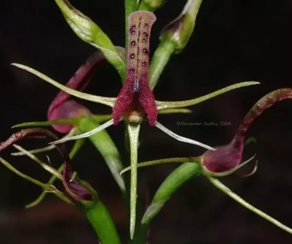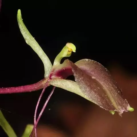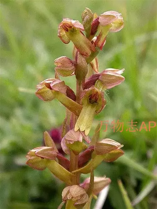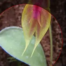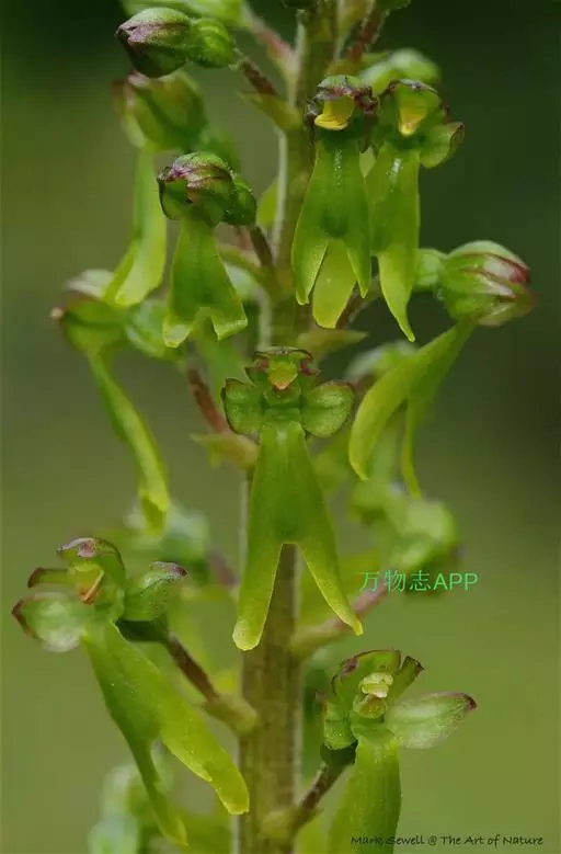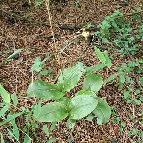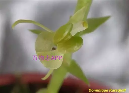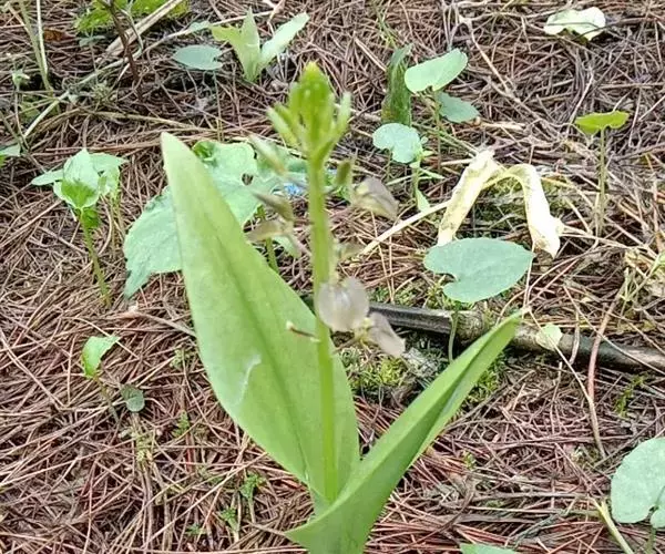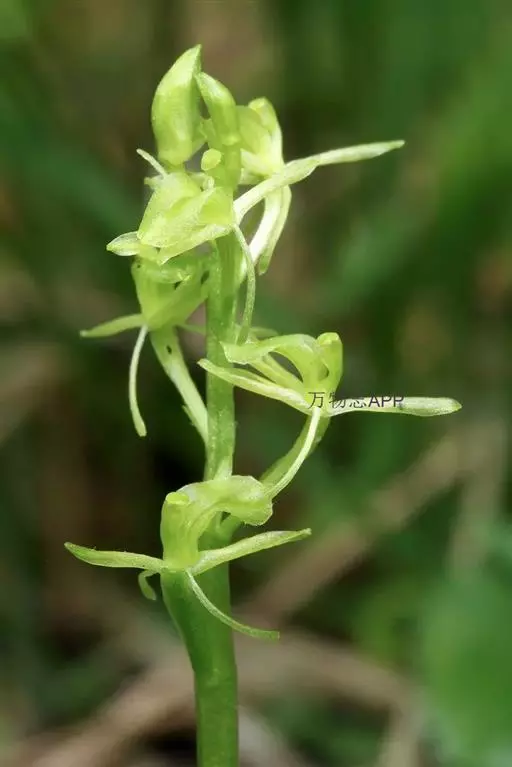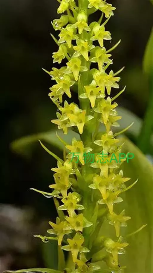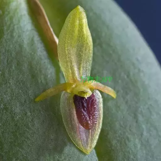 地生草本。假鳞茎卵形,长5-12毫米,直径3-8毫米,外被白色的薄膜质鞘。叶2枚,卵形、卵状长圆形或近椭圆形,膜质或草质,长5-10(-16)厘米,宽2-4(-7)厘米,先端急尖或钝,边缘皱波状或近全缘,基部收狭成鞘状柄,无关节;鞘状柄长3-8厘米,初时抱花葶,果期则多少分离。花葶长12-50厘米;花序柄圆柱形,两侧在花期可见狭翅,果期则翅不明显;总状花序具数朵至10余朵花;花苞片狭卵形,长2-3(-5)毫米;花梗和子房长8-10毫米;花通常淡缘色,有时可变为粉红色或带紫红色;萼片线状披针形,长7-9毫米,宽1.5-2毫米,先端略钝,具3脉;侧萼片稍斜歪;花瓣丝状,长7-9毫米,宽约0.5毫米,具1脉;唇瓣近倒卵形,长6-8毫米,宽4-5毫米,先端具短尖,边缘稍有不明显的细齿或近全缘,基部逐渐变狭;蕊柱长2.5-3.5毫米,上端略有翅,基部扩大。蒴果倒卵状长圆形,长8-13毫米,宽4-6毫米;果梗长5-9毫米。花期6-8月,果期9-10月。