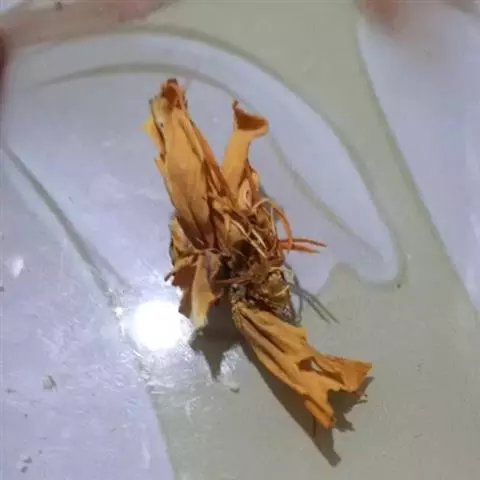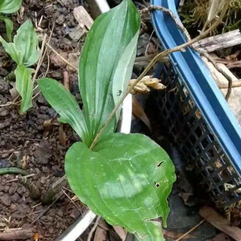 假鳞茎卵形,叶2枚对生,黄褐色,皱缩,展开后卵形、卵状长圆形,纸质,易碎。气微,味淡。