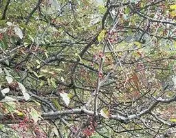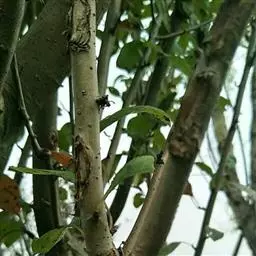 结果后随着树叶密度加大,病虫害逐年加剧。虫害有红蜘蛛、蚜虫,部分地块有金纹细蛾等。