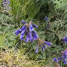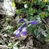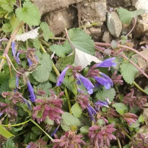 花近无梗,对生,少数聚集在短枝的顶端组成总状花序;苞片小,具柄。花萼卵状钟形,长约4毫米,外面密被白色星状绒毛及腺体,内面无毛,11脉,二唇形,上唇近圆形,全缘或具很短的3齿,下唇2齿,齿卵圆状三角形。花冠蓝紫色,长不及1厘米,外被疏短柔毛,内面无毛,冠筒稍外伸,冠檐二唇形,上唇直伸,2浅裂,裂片卵圆形,下唇宽大,3裂,中裂片最大,内凹,下倾,边缘为齿状,基部缢缩成柄,侧裂片长圆形。