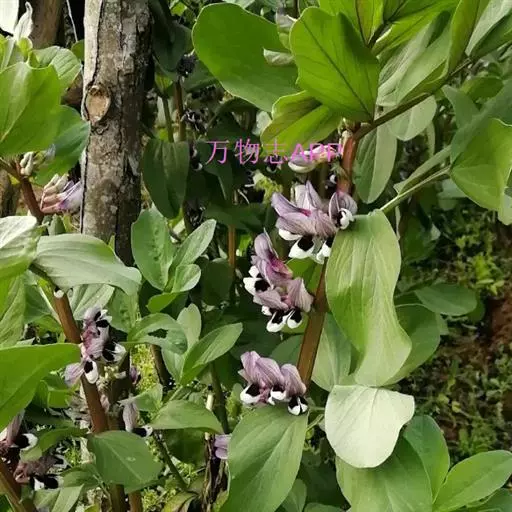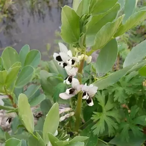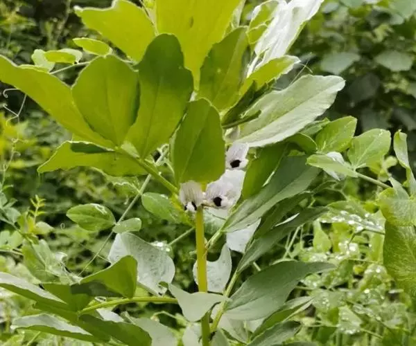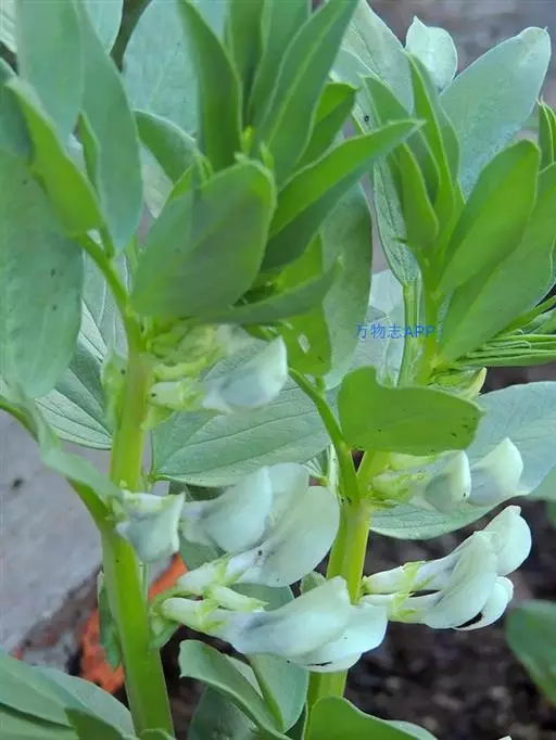 蚕豆(学名:Vicia faba L.):豆科一年生草本,高30-100厘米。主根短粗,多须根,根瘤粉红色,密集。茎粗壮,直立,具四棱,中空、无毛。偶数羽状复叶,叶轴顶端卷须短缩为短尖头;托叶戟头形或近三角状卵形,略有锯齿,具深紫色密腺点;小叶通常两面均无毛。总状花序腋生,花梗近无;花萼钟形,萼齿披针形,下萼齿较长;具花2-4(6) 朵呈丛状着生于叶腋,花冠白色;花柱密被白柔毛。荚果肥厚,成熟后表皮变为黑色。种子长方圆形,近长方形,中间内凹,种皮革质,青绿色,灰绿色至棕褐色,稀紫色或黑色;种脐线形,黑色。花期4-5月,果期5-6月。