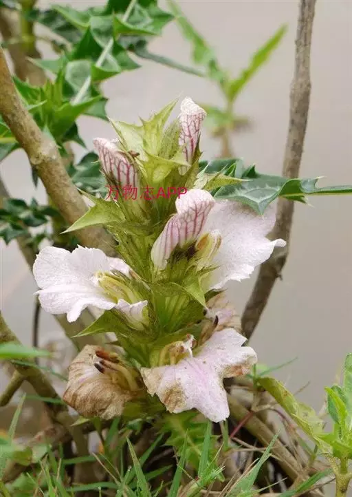直立灌木,高达2米。托叶成刺状;叶片长圆形至长圆状披针形,先端急尖,基部楔形,边缘4-5羽状浅裂,近革质,两面无毛,主脉在上面凹下,主侧脉在背面明显凸起,侧脉每侧4-5,自裂片顶端突出为尖锐硬刺。 穗状花序顶生;苞片对生,宽卵形,长7-8毫米,无刺,早落;小苞片卵形,长约5毫米,革质;花萼裂片4,外方的1对宽卵形,长10-13毫米,顶端微缺,边缘质薄,有时成皱波状,具缘毛,内方的1对卵形,长约10毫米,全缘。花冠白色,长3-4厘米,花冠管长约6毫米,上唇退化,下唇倒卵形,长约3厘米,薄革质,顶端3裂,外面被柔毛,内面上部两侧各有1条3-4毫米宽的被毛带;雄蕊4,近等长,花药1室,纵裂,裂缝两侧各有1列髯毛,花丝粗厚,长1.5厘米,最宽处约2毫米,近软骨质;子房顶部软骨质,花柱有纵纹,长2.2厘米;柱头2裂。 蒴果椭圆形,长2.5-3厘米,有种子4颗。种子扁平,圆肾形,淡黄色。