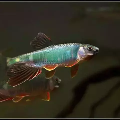 飞凤鱼呈侧扁形,体色随光线变化忽深忽浅,雄鱼体色鲜艳,雌鱼体色较为暗淡。