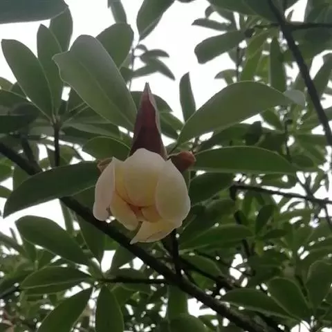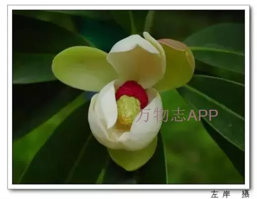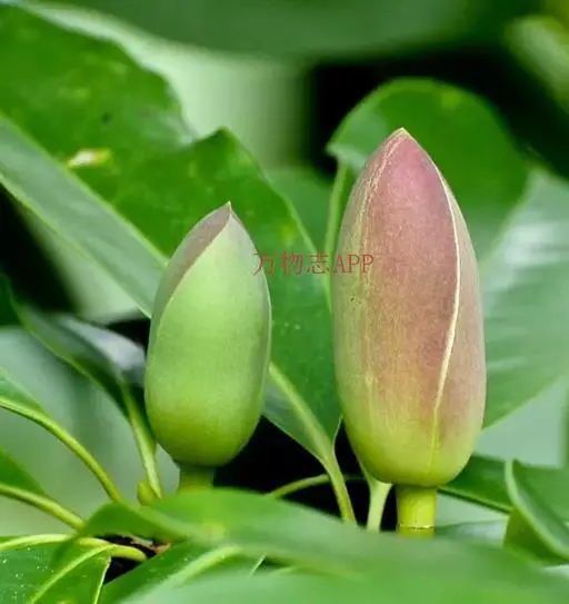 桂南木莲(学名:Manglietia chingii Dandy):常绿乔木,高可达20米,树皮灰色,光滑、芽、嫩枝有红褐色短毛。叶革质,倒披针形或狭倒卵状椭圆形,上面无毛,深绿色有光泽,下面灰绿色,嫩叶被微硬毛或具白粉;侧脉每边12-14条。花蕾卵圆形,花梗细长,向下弯垂,长4-7厘米,仅花被下有1环苞片痕;花被片9-11片,每轮3片,外轮3片常绿色,质较薄,椭圆形。聚合果卵圆形,长4-5厘米;蓇葖具疣点凸起,顶端具短喙;种子内种皮具突起点。花期5-6月,果期9-10月。