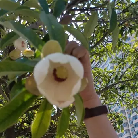 花蕾卵圆形,花梗细长,向下弯垂,长4-7厘米,仅花被下有1环苞片痕;花被片9-11片,每轮3片,外轮3片常绿色,质较薄,椭圆形,长4-5厘米,宽约2.5-2.8厘米,顶端圆钝,中轮肉质,倒卵状椭圆形,长5-5.5厘米,宽2.5-2厘米,内轮肉质,3-4片,倒卵状匙形,长4-4.5厘米,宽1.5-2厘米;雄蕊长约1.3-1.5厘米,花药长8-9毫米,药隔伸出成三角形的尖头,2药室为药隔分开;雌蕊群长1.5-2厘米,下部心皮长0.8-1厘米,背面具3-4纵沟,花柱长约2毫米。