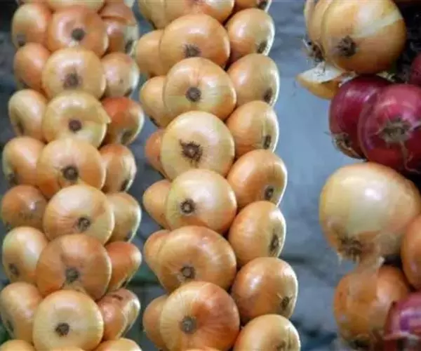 采收晾晒:备作贮藏的洋葱,宜选择黄皮、扁圆形、个体大、辛辣味浓、水分含量低、鳞茎颈部细小的个体。在洋葱植株最下部的1-2片叶片干枯、地上部分开始倒伏时收获为佳。采获后应及时进行晾晒。方法:将洋葱植株斜向排列,使后一排的茎叶正好覆盖在前一排的葱头上,以避免葱头直接受到阳光的曝晒。晾晒期间,每隔2-3天翻动1次,一直晒至叶子发黄为止。 贮藏方法: