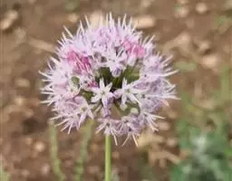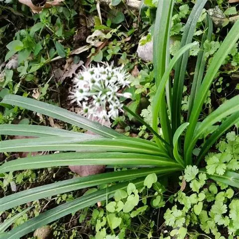 花葶粗壮,高可达1m,中空的圆筒状,在中部以下膨大,向上渐狭,下部被叶鞘;总苞2-3裂;伞形花序球状,具多而密集的花;小花梗长约2.5cm。花粉白色;花被片具绿色中脉,矩圆状卵形,长4-5mm,宽约2mm;花丝等长,稍长于花被片,约在基部1/5处合生,合生部分下部的1/2与花被片贴生,内轮花丝的基部极为扩大,扩大部分每侧各具1齿,外轮的锥形; 子房:近球状,腹缝线基部具有帘的凹陷蜜穴;花柱长约4mm。花果期5-7月。 [3-4]