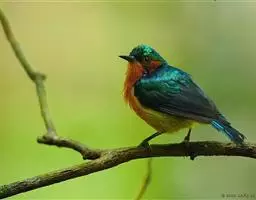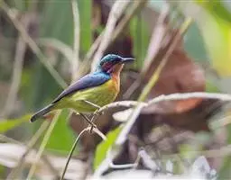 叉尾太阳鸟,雀形目太阳鸟科太阳鸟属留鸟;为小型鸟类,雄鸟头顶辉蓝绿色,上体橄榄绿色,腰明黄色,…