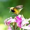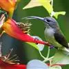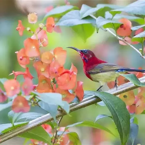 黑胸太阳鸟:小型鸟类,体长9-15厘米。嘴细长而向下曲。雄鸟中央尾羽特长,尾呈楔形,…