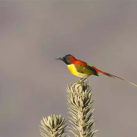 火尾太阳鸟为太阳鸟科太阳鸟属的鸟类。体长20厘米,色彩艳丽。雄鸟红色,具形长的艳猩红色中央尾羽。…