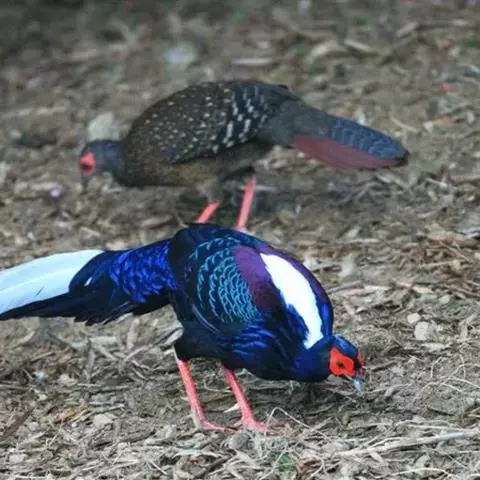 蓝马鸡是珍稀名贵的禽类,羽毛美丽,可作装饰用,头侧绯红,耳羽簇白色、突出于颈部顶上,通体蓝灰色,…