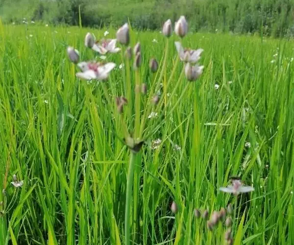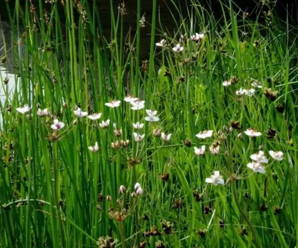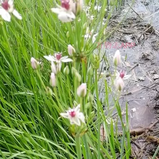 花蔺(Butomus umbellatus)在原产地属多年生挺水草本植物。具有质须根,老根黄褐色,新根白色,最长的根15-20厘米。叶基部丛生,叶片挺水生长,叶色亮绿,椭圆形,长约13厘米,全缘,先端圆形或微凹,基部钝圆,叶面光滑,弧形脉10-12条;叶柄三棱形,长15-20厘米,内具海绵组织,基部鞘状。