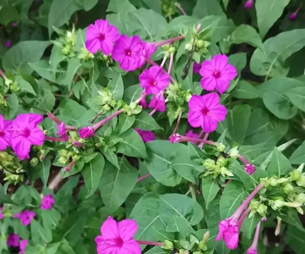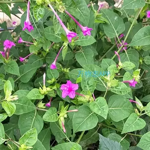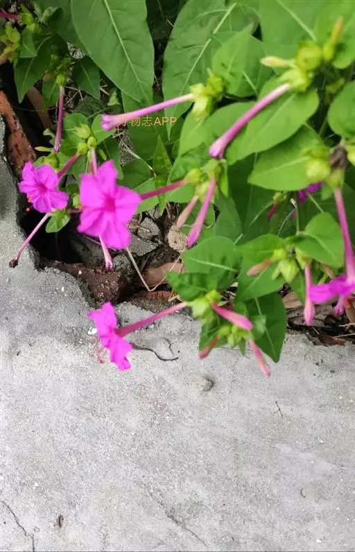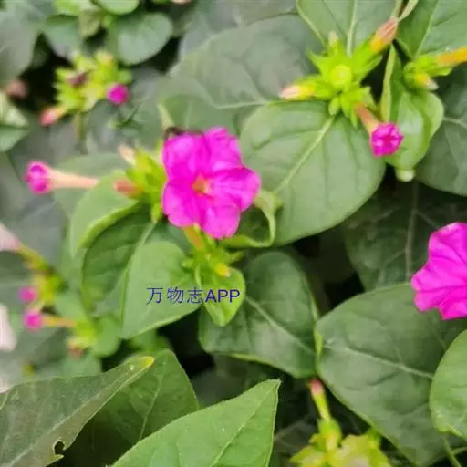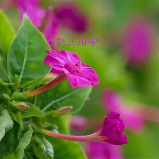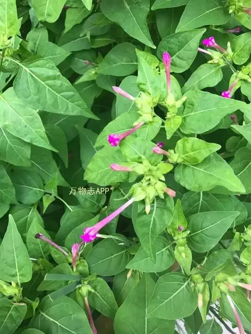 紫茉莉(学名:Mirabilis jalapa L.):草本,高可达1米。根肥粗,倒圆锥形,黑色或黑褐色。茎直立,圆柱形,多分枝,无毛或疏生细柔毛,节稍膨大。叶片卵形或卵状三角形,全缘,两面均无毛,脉隆起。花常数朵簇生枝端,总苞钟形,长约1厘米,5裂,裂片三角状卵形;花被紫红色、黄色、白色或杂色,高脚碟状,筒部长2-6厘米,檐部直径2.5-3厘米,5浅裂;花午后开放,有香气,次日午前凋萎。瘦果球形,直径5-8毫米,革质,黑色,表面具皱纹;种子胚乳白粉质。花期6-10月,果期8-11月。