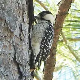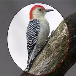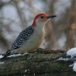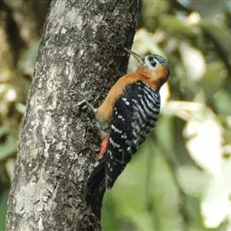 红腹啄木鸟成年雄鸟头项有红帽,翅膀和上体是黑白相间的斑纹状羽毛,腹部有一片红羽毛。头亦大,但颈较长,…