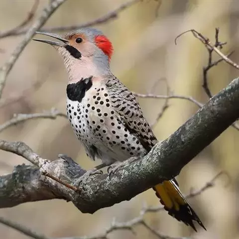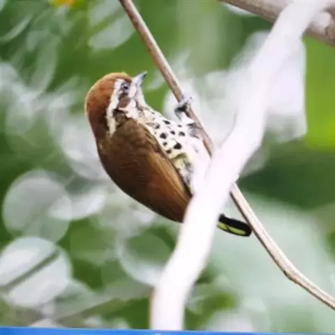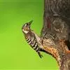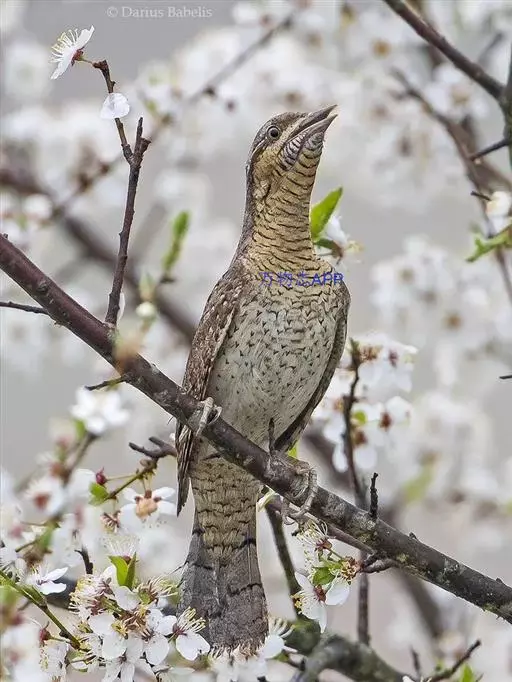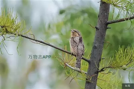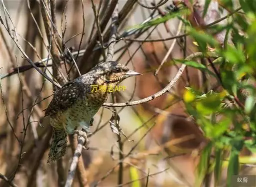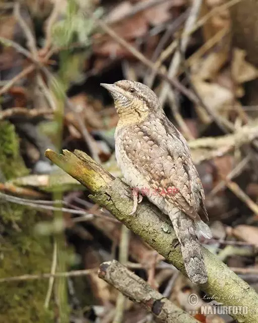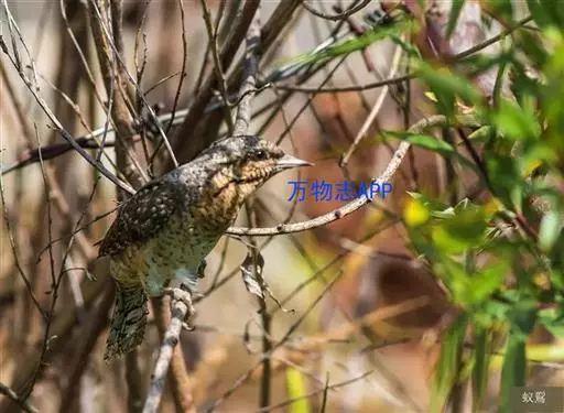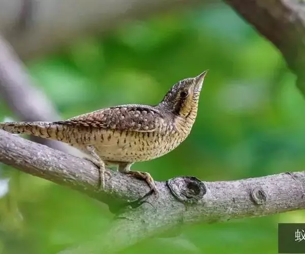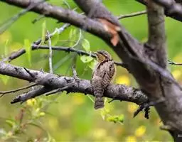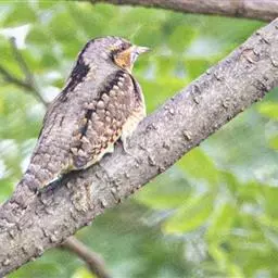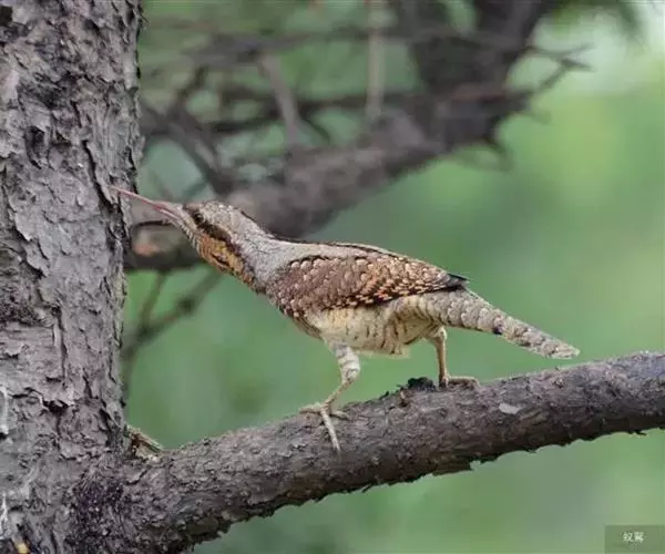 蚁䴕(学名:Jynx torquilla):又名欧亚蚁䴕,䴕形目啄木鸟科蚁䴕属小型鸟类,有6亚种。全长约17厘米。全身体羽黑褐色,斑驳杂乱,上体及尾棕褐色,自后枕至下背有一暗黑色菱形斑块;下体具有细小横斑,就啄木鸟而言,尾较长,有数条黑褐色横斑。栖息于低山丘陵和山脚平原的阔叶林或混交林的树木上。喜欢单独活动。受惊时颈部像蛇一样扭转,俗称“歪脖”。取食蚂蚁,舌长,具钩端及黏液,可伸入树洞或蚁巢中取食。在旧的啄木鸟洞穴中营巢,每窝产卵5-14枚,约12-14天出雏。