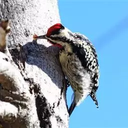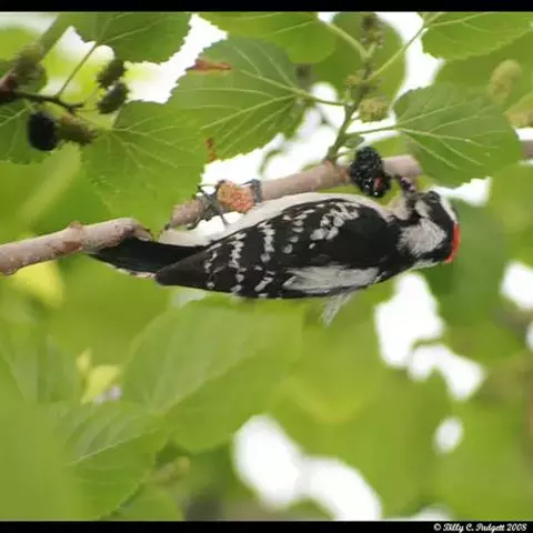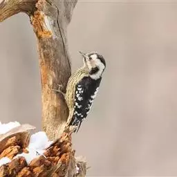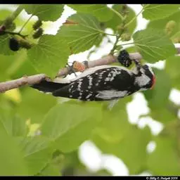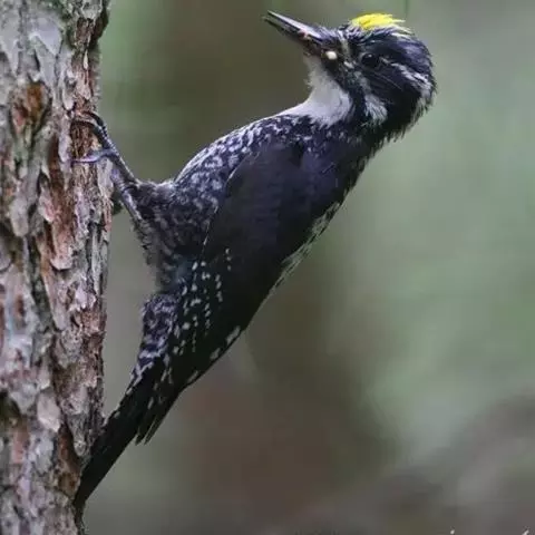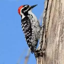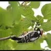 绒啄木鸟,北美洲最小的啄木鸟,白腹黑背和黑项,黑翼上有白色斑点。头部有黑白相间的条纹,尾巴短小,雄…