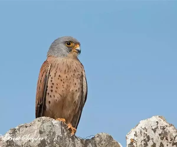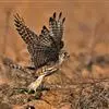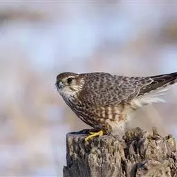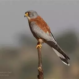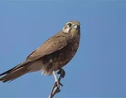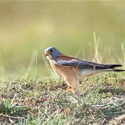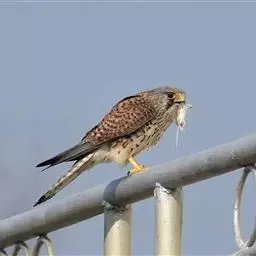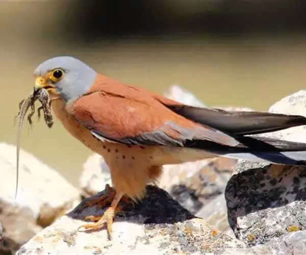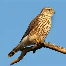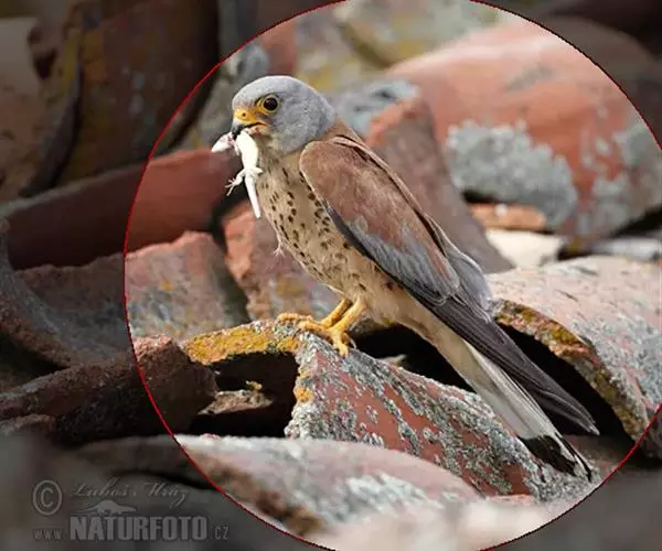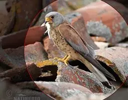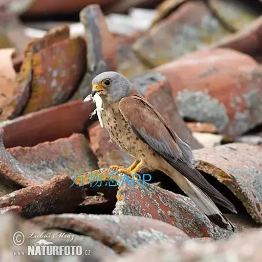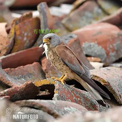 黄爪隼(学名:Falco naumanni):体长29-32厘米,体重124-225克。雌雄鸟异色。雄鸟头、颈和翅上覆羽铅灰色;尾羽淡蓝色,具宽阔黑色次端班和近白色端斑。雌鸟前额为污白色,具纤细的黑色羽干纹;眼上有一条白色眉纹;头、颈、肩、背及翅上覆羽棕黄色或淡栗色,具9-10道黑色横斑和宽的黑色次端斑及白色端斑。幼鸟和雌鸟相似,但上体纵纹和横斑粗著,腰和尾上覆飞淡棕色;中央尾羽蓝灰色,仅具宽阔的黑色次端斑;外侧尾羽棕色,具黑褐色横斑。虹膜暗褐色,嘴蓝灰色,跗和趾淡黄色,爪淡白色。