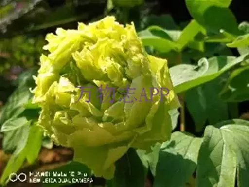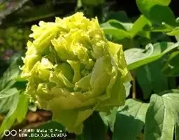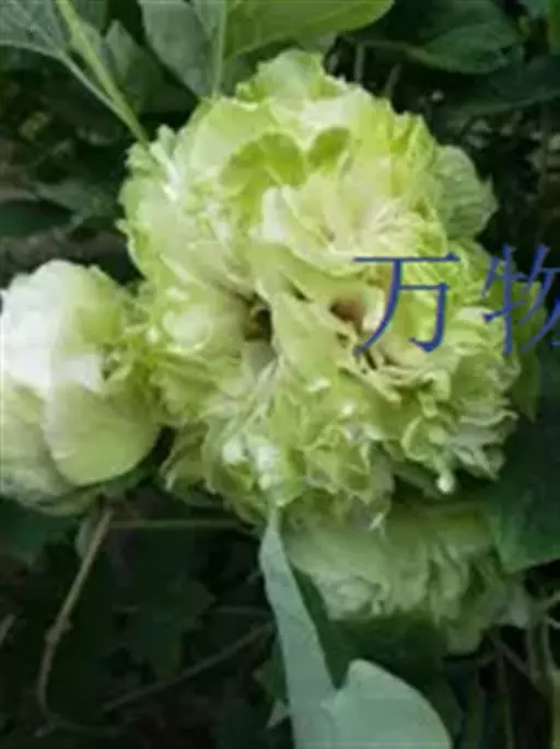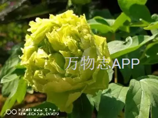 豆绿(学名:Paeonia suffruticosa 'Pea Green'):牡丹四大名品之一。落叶灌木。茎高达2米;分枝短而粗。叶通常为二回三出复叶,顶生小叶宽卵形,表面绿色,无毛,背面淡绿色,有时具白粉,沿叶脉疏生短柔毛或近无毛。花单生枝顶,苞片5,长椭圆形,大小不等;萼片5,绿色,宽卵形,大小不等;花为重瓣,皇冠型或绣球型。花蕾圆形,顶端常开裂;花黄绿色,顶端呈不规则的波状;花丝上部白色,花药长圆形,花盘革质,杯状,紫红色;心皮5,密生柔毛。蓇葖长圆形,密生黄褐色硬毛。花期5月;果期6月。
