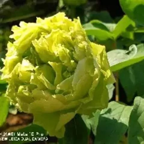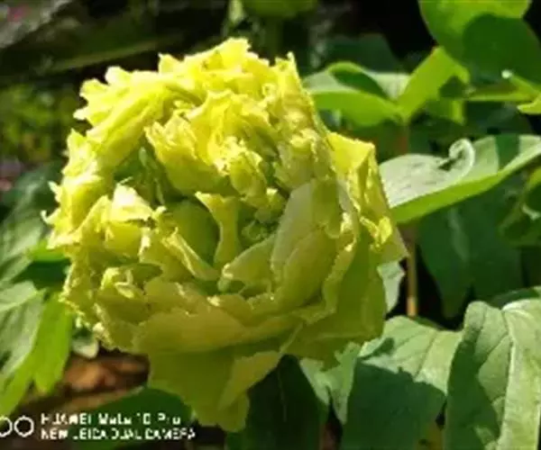 在牡丹品种中,豆绿是唯一纯正的绿色珍品,花为绣球型,因色如青豆而得名。此花是晚开品种,初开时呈青绿色,盛开时颜色渐淡,阳光下花色变白,清爽雅致,风韵独特,有一种另类脱俗的美。